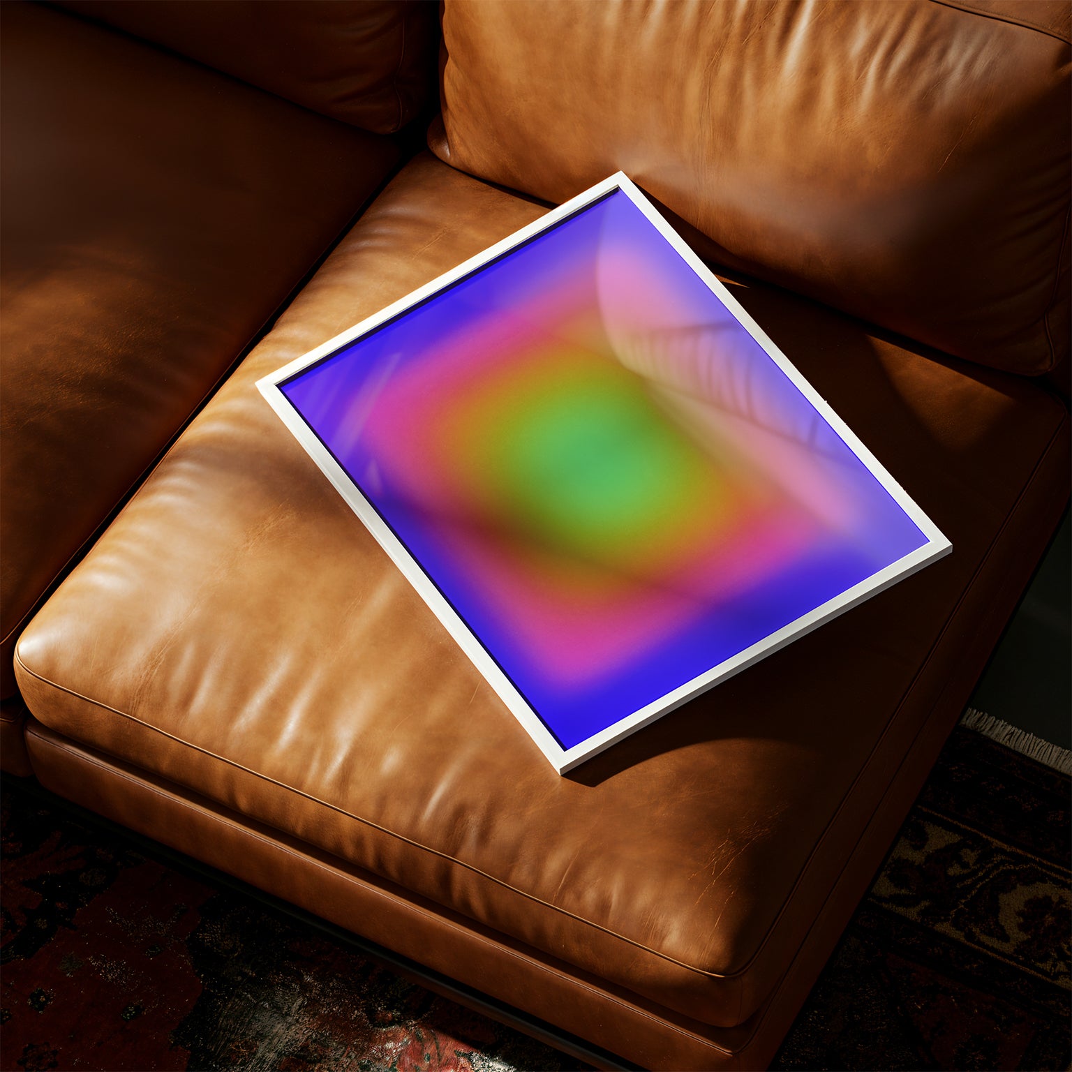 Warm 01 est une présence qui se laisse regarder sans prétention. Le rouge qui encadre la surface attire le regard, puis s’efface doucement dans un cœur de tons rosés, orangés et bleutés, comme si la lumière elle-même respirait. Il n’y a pas de contours, rien que des passages subtils de couleur qui créent un espace où l’œil peut flotter, où le temps semble suspendu. L’œuvre n’impose rien, elle accueille : elle réchauffe sans bruit, apaise sans mots, et transforme le mur qu’elle occupe en un lieu de calme et d’attention. C’est dans cette simplicité, dans ce jeu silencieux entre couleur et profondeur, que se révèle son sens.